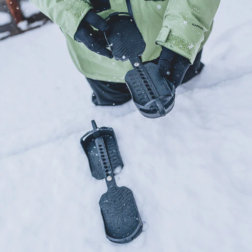 Njihova zožena oblika na sprednjem delu omogoča lažje gibanje stopala, asimetrična zasnova z zobmi (crampon design) pa zagotavlja večjo varnost pri hoji po snegu.